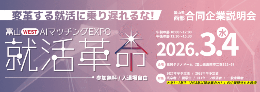 当社は、2026年3月4日(水)に富山県高岡市にて開催される求職者と企業のマッチングイベント“富山WEST AIマッチングEXPO 就活革命”に出展します。